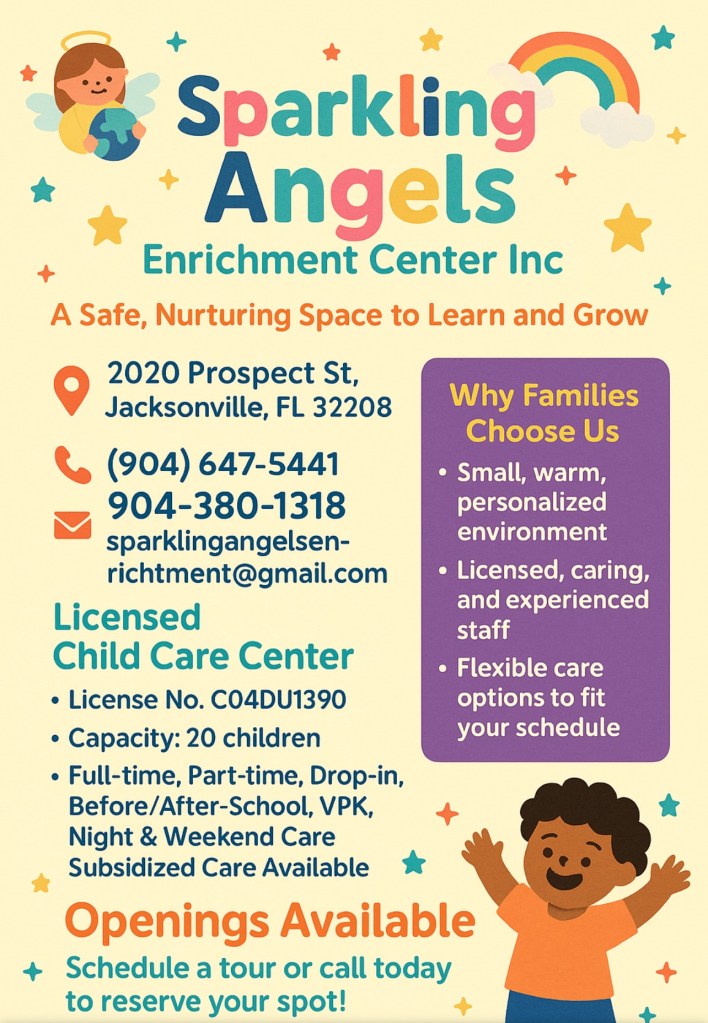 Sparkling Angels Enrichment Center 2 Inc. offers a nurturing ChildCare environment where children can learn, play, and grow. Our programs are designed to support their social, emotional, and physical development in a safe and engaging setting. Contact us now to schedule a visit or learn more about our enrollment process.